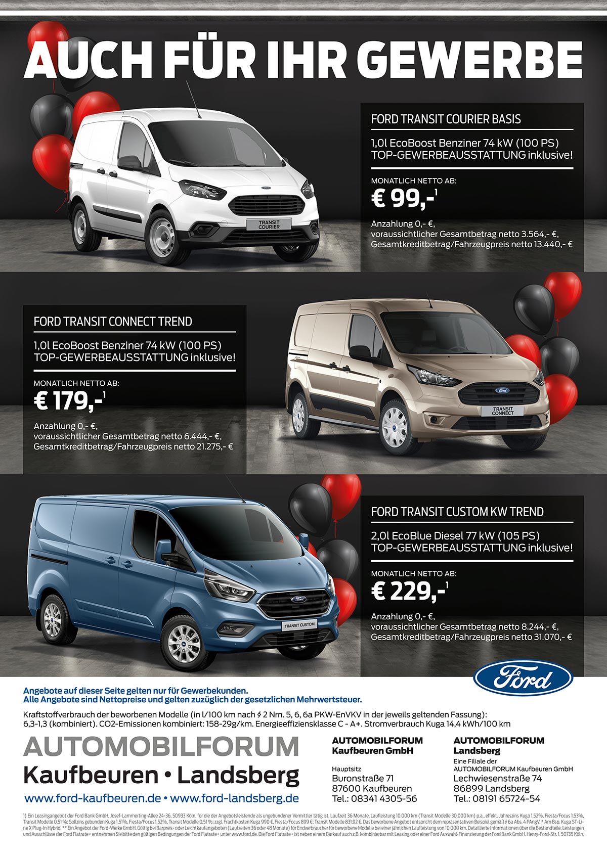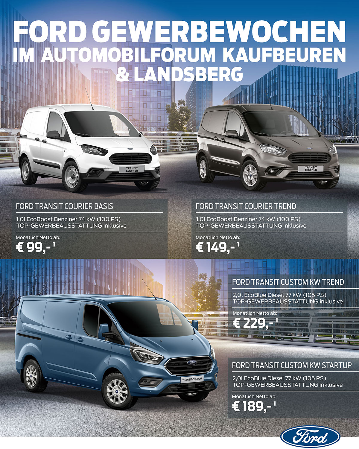 Alle Angebote ausschließlich gültig für Gewerbetreibende. Alle Angebote sind Nettopreise und gelten zzgl. der gesetzlichen Mehrwertsteuer und zzgl. Frachtkosten 831,92 €. Die beworbenen Beispiele entsprechen den repräsentativen Beispielen gemäß § 6a Abs. 4 PAngV. 1) Ein Leasingangebot der Ford Bank GmbH, Josef-Lammerting-Allee 24-34, 50933 Köln für die der Angebotsleistende als ungebundener Vermittler tätig ist. Ohne Anzahlung, Laufleistung gesamt 36 Monate, Laufleistung in km p.a. 30.000. Ef. Jahreszins und Sollzinssatz geb. p.a. 1,51 %; Summe aller Raten/voraussichtlicher Gesamtbetrag: Courier Basis 3.564 €, Courier Trend 5.364 €, Custom Trend 8.244 €, Cus- tom Startup 6.804 €, Connect Basis 5.724 €, Connect Trend 6.444 €, Transit Basis 7.884 €, Transit Trend 10.044 €; Gesamtkreditbetrag/Fahrzeugpreis: Courier Basis 13.440 €, Courier Trend 19.224,45 €, Custom Trend 31.070 €, Custom Startup 19.990 €, Connect Basis 18.380 €, Connect Trend 21.275 €, Transit Basis 30.350 €, Transit Trend 38.190 €.