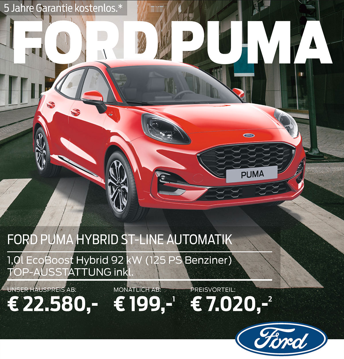 Angebot gilt nur für Privatkunden. Das beworbene Beispiel entspricht dem repräsentativen Beispiel gemäß § 6a Abs. 4 PAngV. 1) Ein Leasingangebot der Ford Bank AG, Josef-Lammerting-Allee 24 -34, 50933 Köln für die der Angebotsleistende als ungebundener Vermittler tätig ist. Ohne Anzahlung, Laufleistung gesamt 48 Monate, Laufleistung in km p.a. 10.000. Eff. Jahreszins 2,03 %; Sollzinssatz geb. p.a. 2,01 %; Summe aller Raten/voraussichtlicher Gesamtbetrag 9.552 €; Gesamtkreditbetrag/Fahrzeugpreis 29.600 €. Zzgl. Frachtkosten 890 €. 2) Preisvorteil gegenüber der unverbindlichen Preisempfehlung des Herstel- lers zum Zeitpunkt der Erstzulassung. *Zwei Jahre Neuwagengarantie des Herstellers sowie Ford Protect Garantie-Schutzbrief (Neuwagenanschlussgaran- tie) inkl. Ford Assistance Mobilitätsgarantie für das 3.–5. Jahr, bis max. 50.000 km Gesamtlaufleistung (Garantiegeber: Ford-Werke GmbH) kostenlos. Gültig für Privatkunden beim Kauf eines noch nicht zugelassenen Ford Neufahrzeuges, nach Eingabe der Fahrgestellnummer in der FordPass App und Auswahl des bevorzugten Ford Händlers. Sofern vorhanden, Aktivierung von FordPass Connect. Die Eingabe/Hinterlegung bzw. ggf. Aktivierung muss spätestens zwei Wochen nach Zulassung erfolgen. Es gelten die jeweils gültigen Garantiebedingungen.