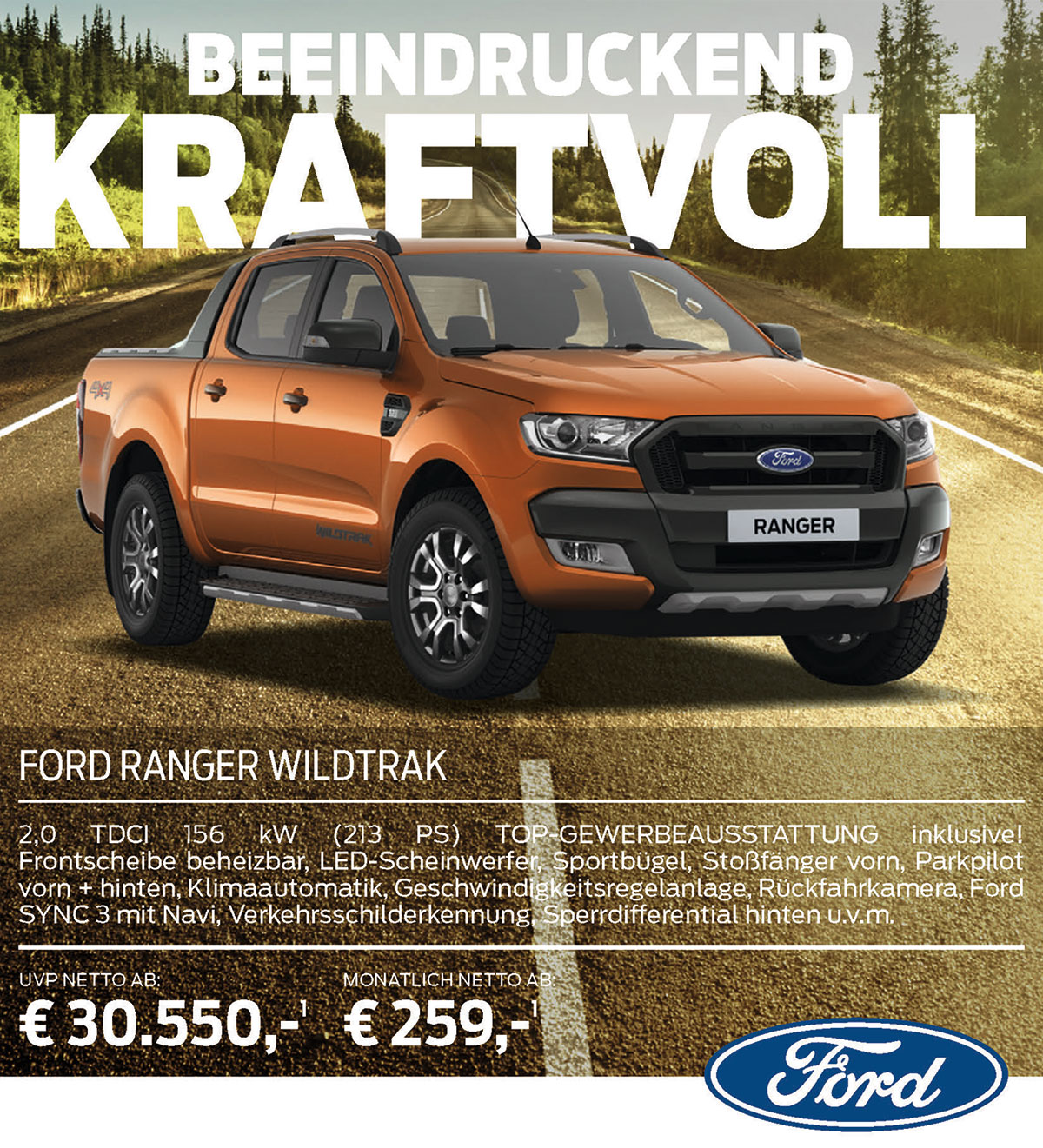 1) Angebot ausschließlich gültig für Gewerbetreibende. Preise sind Nettopreise und gelten zzgl. der gesetzlichen Mehrwertsteuer und zzgl. Frachtkosten 1.190 €. Das beworbene Beispiel entspricht dem repräsentativen Beispiel gemäß § 6a Abs. 4 PAngV. 2) Ein Leasingangebot der Ford Bank AG, Josef- Lammerting-Allee 24 -34, 50933 Köln für die der Angebotsleistende als ungebundener Vermittler tätig ist. Ohne Anzahlung, Laufleistung gesamt 36 Monate, Laufleistung in km p.a. 10.000. Summe aller Raten / voraussichtlicher Gesamtbetrag 9.324 €; Gesamtkreditbetrag/Fahrzeugpreis 30.550 €.